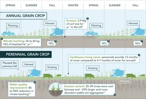 Annual cereal grains account for ~50% of human food calories, but cultivation of these crops has resulted in major environmental and social issues worldwide. For nearly three decades, researchers have been breeding intermediate wheatgrass—a perennial cool-season grass—to serve as the world’s first commercial-scale perennial grain crop to improve agricultural sustainability. Introducing a perennial grain crop onto landscapes and into markets has significant potential to reduce environmental impacts of agriculture, improve farmer economics, and offer a healthy new food ingredient for consumers. However, transdisciplinary collaboration is required to upscale Kernza to maximize positive societal impacts.